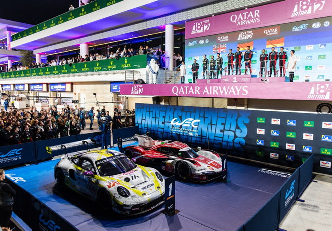 Completando el podio estuvo el segundo Porsche de fábrica perteneciente al equipo Matt Campbell, Michael Christensen y Frederic Makowiecki, el equipo que luchó contra problemas de vibración del auto. El bloqueo del podio de Porsche en Qatar marca el primero para un fabricante en el WEC desde Audi en Spa en 2013.
