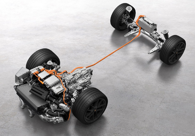 El conjunto motriz también incorpora un motor eléctrico síncrono de imanes permanentes, integrado en la nueva transmisión de doble embrague (PDK) de ocho velocidades. Este motor, incluso detenido, proporciona un par adicional de hasta 150 Nm al motor bóxer y ofrece un aumento de potencia de hasta 40 kW. Tanto este motor eléctrico como el del turbocompresor se alimentan de una batería de alto voltaje, ligera y compacta. Esta batería es similar en tamaño y peso a una batería de arranque convencional de 12 voltios, pero almacena hasta 1.9 kWh de energía (bruta) y opera a una tensión de 400 V. Para optimizar el peso total, Porsche ha instalado una batería ligera de iones de litio para el sistema eléctrico de a bordo de 12 V.