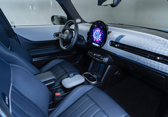 • Materiales innovadores caracterizan la atmósfera agradable en el interior del MINI Cooper. Un proceso de tejido especialmente desarrollado se utiliza para crear la estructura versátil y fácil de cuidar del textil en diseño bicolor hecho de poliéster reciclado que cubre el tablero de instrumentos y otras superficies interiores. Las superficies textiles se extienden a través del tablero curvado y hacia los paneles de las puertas. Las rejillas de ventilación tienen un diseño especialmente plano, su disposición horizontal asegura un flujo de aire uniforme en el tablero de instrumentos. La dirección de las rejillas se puede ajustar fácilmente.