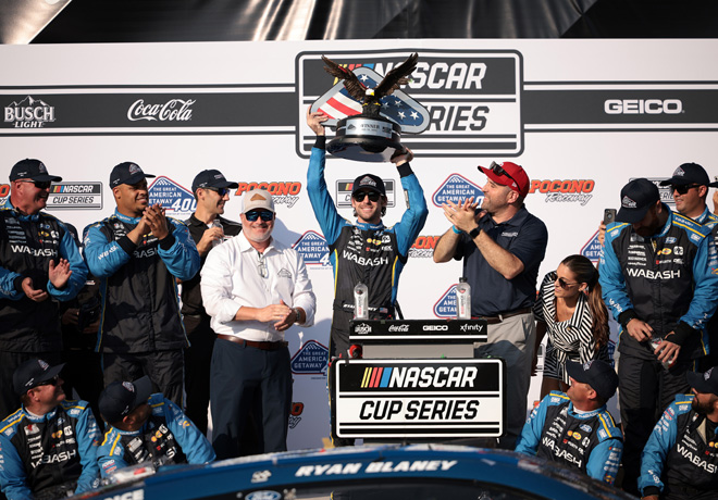 Ryan Blaney logró en Pocono su segunda victoria de la temporada. El campeón defensor lideró 44 de las 160 vueltas de la carrera con el Ford Nº12 del Team Penske, venciendo por 1.312 segundos a su escolta Denny Hamlin. Este triunfo fue el duodécimo de su carrera en la mayor división de NASCAR.