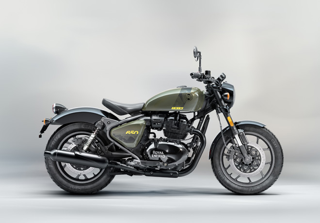 La Royal Enfield Shotgun 650 estará disponible en tres exclusivas variantes de colores: Sheet Metal Grey, Green Drill, y Stencil White.