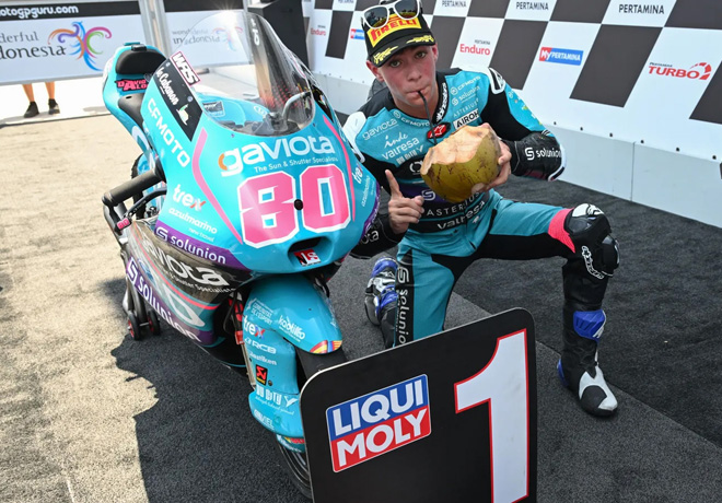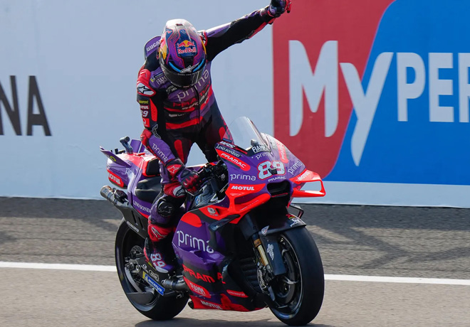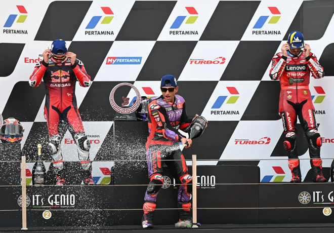 Tras un sábado muy agridulce, en el que logró una incontestable ‘pole’ pero se fue al suelo en la primera vuelta del Sprint, Jorge Martín (Prima Pramac Racing) se repuso de manera excepcional en la carrera del Gran Premio Pertamina de Indonesia, liderando todas las vueltas. ‘Martinator’, quien logra su primera victoria dominical desde Le Mans, amplía su ventaja de 12 a 21 puntos respecto a Francesco Bagnaia (Ducati Lenovo Team), que terminó 3º, por detrás de Pedro Acosta (Red Bull GASGAS Tech3).