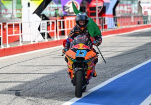 Superado el meridiano de la prueba, Bagnaia comenzó a rodar a un ritmo meteórico, lo que le permitirÃa acortar distancias rápidamente con Bastianini y MartÃn. Pilotando al lÃmite, ‘Pecco’ se fue al suelo en la curva 8 a falta de 7 vueltas para el final, dejando paso al podio a Marc Márquez, mientras Bastianini trataba de reducir el golpe mientras batallaba por la victoria con el piloto de Pramac. En el último giro, Bastianini se metió por el interior de la curva 4, tocándose con el ’89’, que se vio obligado a irse largo y conformarse con la segunda posición.