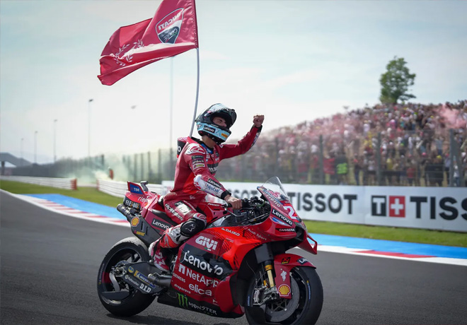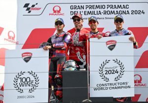Enea Bastianini (Ducati Lenovo Team) se congratuló este domingo en el Gran Premio de la Emilia-Romaña con una victoria al lÃmite sobre Jorge MartÃn (Prima Pramac Racing), que se decidió en las últimas curvas. El piloto de Ducati consiguió el triunfo número 100 de la marca, el mismo dÃa en que la fábrica italiana confirmó el tÃtulo de constructores de 2024. Marc Márquez (Gresini Racing MotoGP) terminó 3º, tras aprovechar la caÃda de Francesco Bagnaia (Ducati Lenovo Team), quien llegará a Indonesia con 24 puntos de desventaja respecto a «Martinator».
