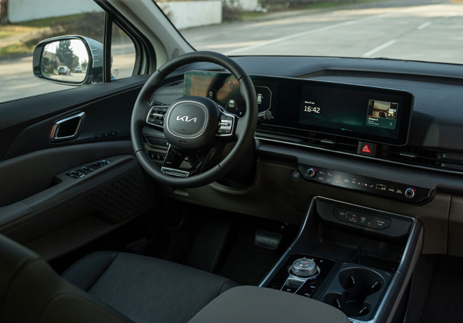 Al ingresar al vehÃculo se puede observar la incorporación de detalles futuristas a un diseño moderno y espacioso, en donde se destaca la nueva pantalla panorámica curva de 12,3» + 12,3» integrada bajo un único panel. Da un paso adelante al ofrecer conectividad inalámbrica simultánea para dos celulares, compatible con Android Auto y Apple CarPlay, y siete puertos USB-C distribuidos en la cabina. Además, cuenta con doble techo solar, tapizados de cuero ecológico, con butacas delanteras calefaccionadas y con ajuste eléctrico que ofrecen una experiencia de primera clase. Adicionalmente, Carnival ahora incorpora la nueva llave inteligente de Kia, con diseño más sofisticado, que permite al usuario accionar las puertas laterales y portón trasero eléctricos, los alza-cristales e inclusive encender el vehÃculo, de manera remota.