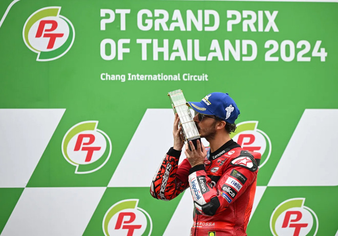 En un domingo completamente impredecible, donde la lluvia se alzó como clara protagonista, Francesco Bagnaia (Ducati Lenovo Team) sacó a relucir su mejor versión en el Gran Premio de Tailandia para alzarse con la victoria, la novena de 2024, y reducir su desventaja de 22 a 17 puntos en la general con respecto a Jorge Martín (Prima Pramac Racing), quien fue segundo. Pedro Acosta (Red Bull GASGAS Tech3) completó el podio de una carrera que sentenció las remotas posibilidades de coronación de Marc Márquez (Gresini Racing MotoGP) y Enea Bastianini (Ducati Lenovo Team), ya que ambos se fueron al suelo.