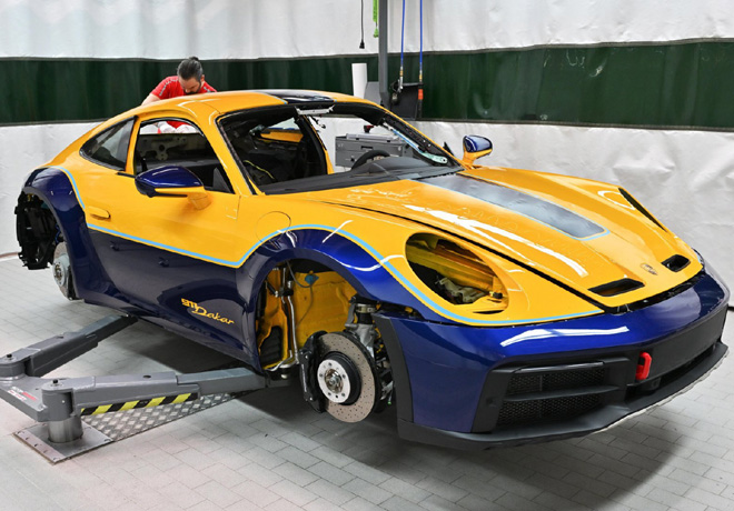 La pintura de los modelos 911 Dakar con el paquete Rallye Design difiere del proceso de pintura normal y tiene un atractivo especial: el acabado bicolor en blanco/azul Gentian metalizado con franjas decorativas en dorado/rojo. Tras implementar la capa de fondo blanca, los trabajadores aplican manualmente la pintura azul de contraste a la carrocería del coche. Este proceso tiene una duración aproximada de siete horas y media.