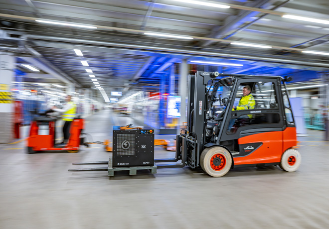 Toda la flota logística en Planta e Regensburg está siendo equipada actualmente con trenes de fuerza eléctricos Las baterías utilizadas en los vehículos industriales deben cambiarse dos veces por turno. El reemplazo de la batería, que se realiza manualmente usando una grúa, toma alrededor de 15 minutos y requiere espacio.