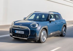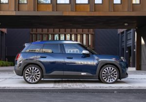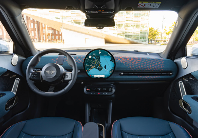 El nuevo MINI Aceman SE se presenta con particular elegancia en el distintivo color de carrocerÃa Indigo Sunset Blue, que armoniza a la perfección con el moderno telón de fondo de la capital danesa.