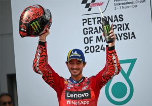 En unas primeras vueltas realmente formidables entre Francesco Bagnaia (Ducati Lenovo Team) y Jorge Martín (Prima Pramac Racing), el vigente Campeón sacó a relucir todo su talento para lograr una trabajada victoria, la décima de la temporada, y reponerse del difícil Sprint del sábado. Martín, en un acto de valentía, no dio su brazo a torcer y lo intentó hasta el final. Finalmente, ‘Martinator’ terminó segundo y lidera la clasificación por 24 puntos, con 37 todavía en juego, a falta de tan solo una ronda para terminar la temporada. Enea Bastianini (Ducati Lenovo Team) completó el podio.