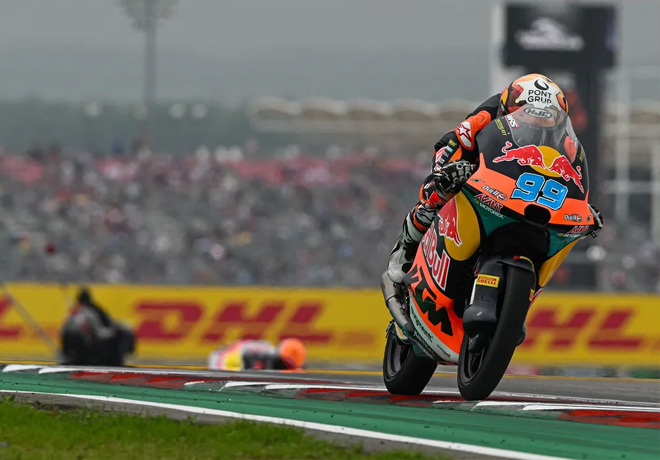 La tensión estaba en el aire antes de que los motores rugieran, con la lluvia regresando tal como ocurrió en Moto2. Estos minutos previos a la salida fueron pura incertidumbre, ya que todos se debatían entre las opciones de neumáticos, con la carrera inicialmente declarada en mojado. La tensión aumentó aún más a medida que pasaban los minutos. Cuando la parrilla comenzó a despejarse, a un minuto de la salida, Marc Márquez (Ducati Lenovo Team) salió corriendo hacia el box para tomar la otra moto y ponerse en marcha desde el ‘pitlane’.
