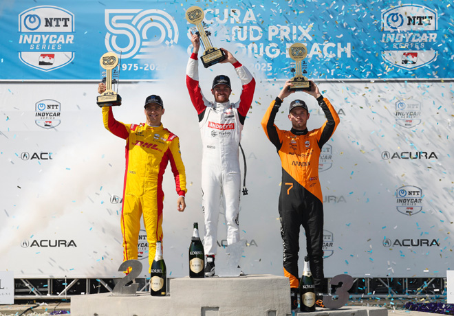 Christian Lundgaard (Chevrolet Nº7 / Arrow McLaren) terminó tercero tras adelantar a Felix Rosenqvist (Honda Nº60 / Meyer Shank Racing), en la curva 1, por el último puesto del podio a cinco vueltas del final. Rosenqvist se ubicó cuarto haciendo posible que los cuatro primeros clasificados también sean los primeros cuatro del campeonato. El dos veces ganador de Long Beach, Will Power, completó los cinco primeros con el Chevrolet Nº12 del Team Penske.