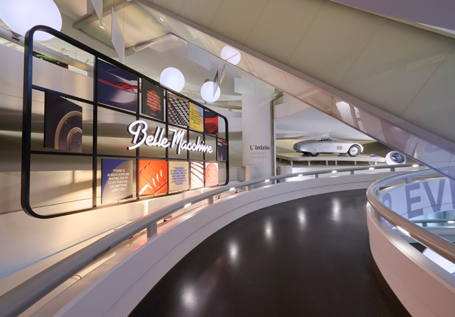 «Belle Macchine.Diseño Automotriz Italiano en BMW» se extiende a través de cinco plataformas y rampas en el icónico “tazón” del Museo BMW. La exposición comienza con una introducción general al mundo del diseño italiano, ilustrada con exhibiciones de moda y diseño de productos. La influencia de renombrados estudios de diseño en la creación de carrocerías de BMW ocupa una gran parte de la exposición.