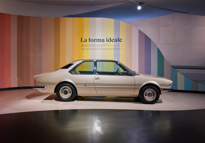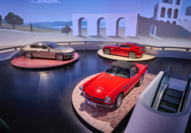 Así, el vehículo conceptual BMW Garmisch, diseñado por Marcello Gandini, representa un arquetipo del estilo italiano y ha contribuido significativamente a la forma de las primeras series BMW 3 y 5 en la década de 1970. Numerosos vehículos de serie exhibidos, como el popular BMW 1800 TI/SA, demuestran que muchos modelos se han beneficiado con éxito de la influencia estilística de los diseñadores italianos. También se destaca la adquisición del fabricante de automóviles GLAS por parte de BMW con tres vehículos, entre ellos el BMW 3000 V8, cariñosamente llamado «Glaserati».