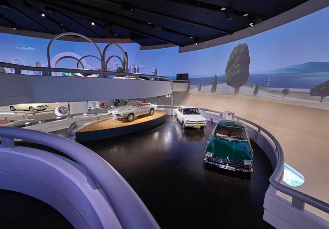 A lo largo de las rampas entre las plataformas, el público es llevado a un viaje visual que, entre otras cosas, hace una parada en el legendario Concorso d’Eleganza Villa d’Este en el Lago de Como, el concurso de belleza más antiguo para automóviles históricos. Los dibujos de diseño presentados allí destacan la huella artística de los diseñadores italianos.