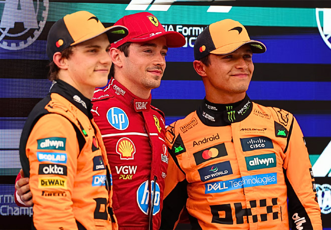 Tras unas gotas de lluvia en la Q2, y con las condiciones de la pista empeorando, Leclerc marcó un impresionante tiempo de 1´15.372 en su última vuelta a la Q3, superando a los anteriores líderes de la sesión, Piastri y Norris, por apenas milésimas.
