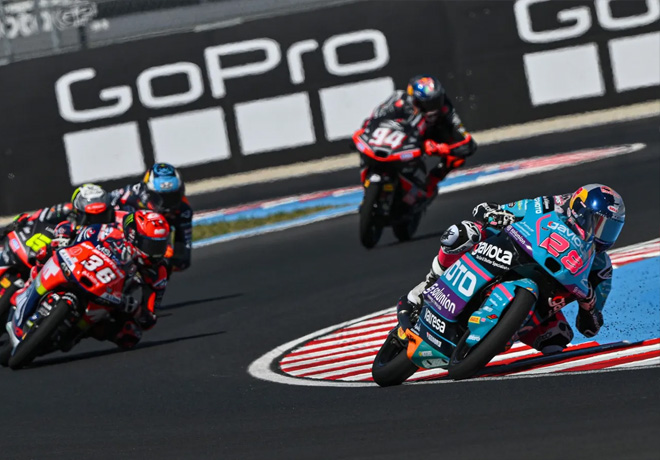 Con Fabio Di Giannantonio partiendo desde el pit lane tras cambiar la moto en la warm-up lap, la salida prometía ser tranquila, con el ‘poleman’ Marc Márquez (Ducati) intentando mantener su posición. Sin embargo, un hambriento Marco Bezzecchi (Aprilia Racing) no dudó en plantarle cara y, tras un pequeño toque entre ambos, el italiano logró hacerse con la primera plaza, relegando a Márquez a la tercera posición, justo por detrás de Franco Morbidelli. Pedro Acosta (KTM) y Fermín Aldeguer (Gresini Racing MotoGP) completaban el Top 5 en esos primeros momentos, mientras Francesco Bagnaia (Ducati) remontaba hasta la octava posición y Jorge Martín (Aprilia Racing) hasta la sexta. Todo esto sucedía en paralelo a las primeras caídas de la carrera, protagonizadas por Enea Bastianini (KTM) y Alex Márquez (Gresini Racing MotoGP).
