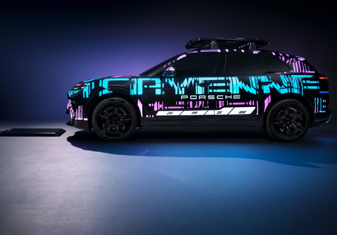 En su primera aparición oficial en el Reino Unido, el Cayenne causó sensación con una llamativa pintura. El coche expuesto en el IAA de Múnich está dotado de un innovador acabado fluorescente de diseño muy similar. En cuanto fluye la electricidad, se crea una emocionante imagen de la carrocería con superficies de colores vivos, cuyo patrón de camuflaje ha sido diseñado por Style Porsche. Algunas secciones se han dejado deliberadamente sin pintar y permanecen oscuras. Cinco tonos de color, desde el azul hasta el violeta, se han aplicado de forma selectiva.