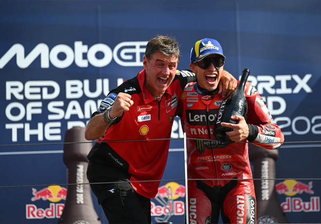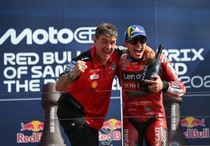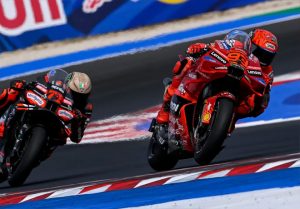 Marc Márquez (Ducati) logró imponerse a un fortísimo Marco Bezzecchi (Aprilia Racing) en un tenso y emocionante Gran Premio de San Marino. El líder indiscutible, que alcanza el récord de puntos con 512, controló a la perfección al italiano, que buscaba completar un doblete ante su público, para sumar su undécima victoria de la temporada y dejar el Mundial muy de cara de cara a Japón.