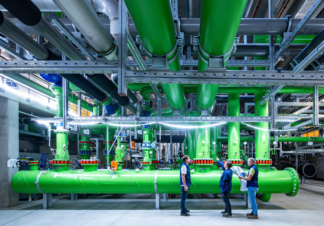 El calor residual de los procesos de producción se utiliza para calentar la cafeterÃa, el almacén y los edificios auxiliares a bajas temperaturas. Para ello, bombas de calor en el Centro de EnergÃa convierten el agua refrigerada a aproximadamente 23°C calentada por las plantas de producción en energÃa térmica a unos 60°C. Cuatro bombas de calor, cada una con 1.8 MW, garantizan una capacidad de calefacción tolerante a fallos.