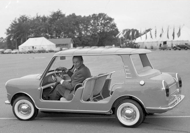 Aunque el diseñador original del Mini aprobó el diseño de los coches, él no fue responsable de ello. En su lugar, el Jefe de Diseño de BMC, Dick Burzi –quien además tenÃa ancestros italianos– creó el techo flotante, sin pilares B. Originalmente, el coche no iba a tener techo salvo una lona que pudiera montarse y desmontarse cuando fuera necesario. Sin embargo, esta idea se abandonó a favor del techo permanente.