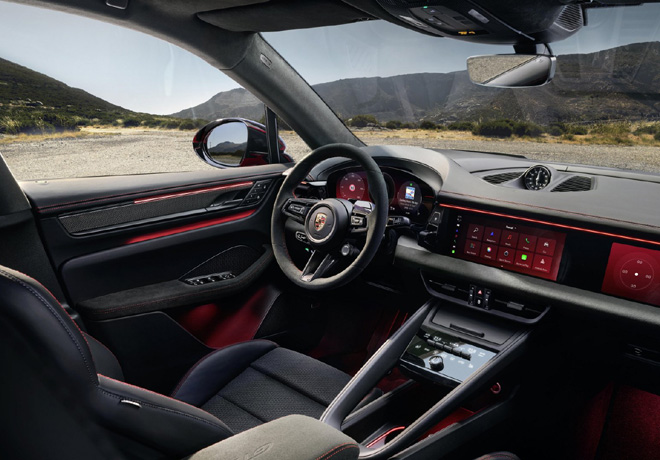 Por primera vez en el Macan Electric, el paquete interior GTS opcional permite coordinar los colores del exterior y el interior. Este pack de equipamiento está disponible en rojo Carmín, gris Pizarra o azul Lugano para hacer juego con los colores de carrocería correspondientes. Las costuras decorativas de contraste en los asientos, el volante, los paneles de las puertas y la parte superior del salpicadero adoptan el color respectivo, al igual que los cinturones de seguridad y las letras GTS de los asientos. Estas tres siglas también están presentes en el volante, en la misma tonalidad. El paquete interior GTS incluye el paquete interior de carbono, que añade molduras de fibra de carbono en el volante, el salpicadero y los paneles de las puertas.