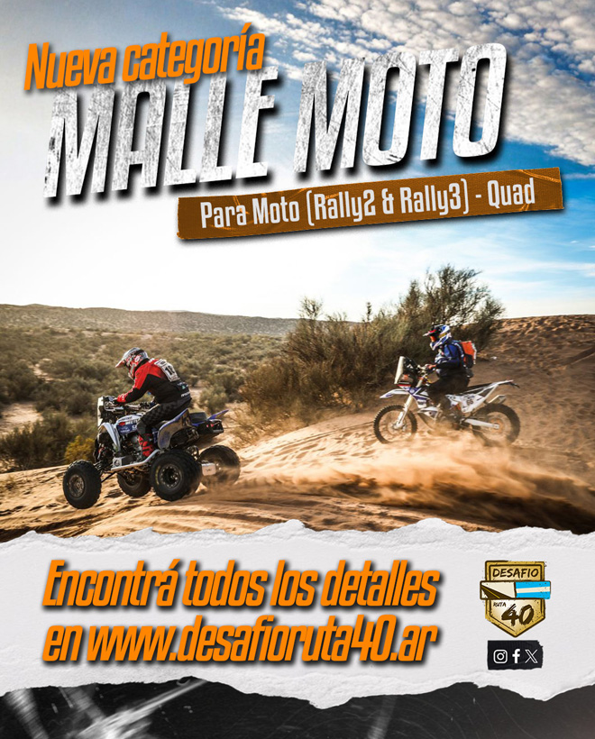 En Malle Moto, los pilotos competirán sin asistencia externa, siendo responsables del mantenimiento y reparación de sus motos. Esta modalidad estará abierta a competidores de Moto (Rally 2, Rally 3) y Quads y se regirá por un reglamento deportivo específico. Su incorporación en el Desafío Ruta 40 refuerza el compromiso del evento con la diversidad y la exigencia deportiva.