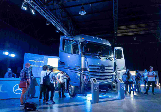 A través de cascos de realidad virtual, los visitantes pueden simular situaciones reales de conducción y experimentar cómo funcionan los sistemas inteligentes del Actros. Entre ellos se destacan el Active Brake Assist 5, que detecta obstáculos y frena automáticamente en caso de emergencia; el innovador sistema MirrorCam, que reemplaza los espejos tradicionales por cámaras digitales que mejoran la visibilidad y reducen la resistencia al viento; el control de carril, que alerta al conductor ante desvíos involuntarios; y el control de proximidad, que regula la distancia con el vehículo que circula adelante. También se presentan el sistema de gestión de flotas Fleetboard, el puesto de conducción digital Multimedia Cockpit y el control crucero inteligente, que optimizan la eficiencia operativa y elevan la experiencia de manejo.