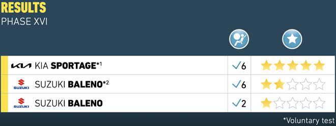Estos resultados muestran que el renovado Kia Sportage obtuvo cinco estrellas. Suzuki, con una gran reacción tras la selección de la versión de dos bolsas de aire del Baleno, calificada con una estrella, y la estandarización de la versión de seis bolsas de aire, obtuvo dos estrellas.