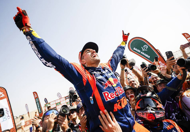 La alegría es total en el clan Red Bull KTM Factory Racing, mientras que el piloto estadounidense de Monster Energy Honda HRC, que se queda sin el ansiado triplete, encaja su derrota con amargura y dignidad. El piloto argentino gana su primer Dakar, y acompaña en el palmarés a su hermano Kevin, ganador del Dakar en 2021 y 2023.