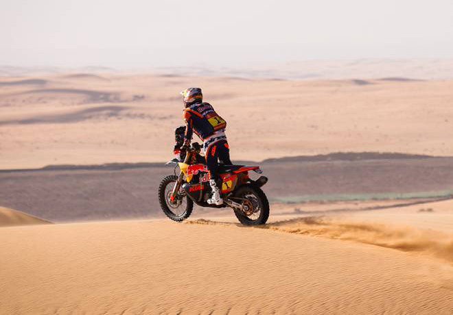 Daniel Sanders se lanzó dispuesto a dar un gran espectáculo en la primera gran etapa de dunas con meta en Riad justo antes del día de descanso. Tras salir de Ha’il en 3ª posición, el defensor del título superó por el camino a Nacho Cornejo y a su compañero de equipo Luciano Benavides para terminar la especial en solitario y conseguir una gran parte de las bonificaciones destinadas al líder de la etapa (2’40”), lo que le ha servido para poner tierra de por medio en la general.