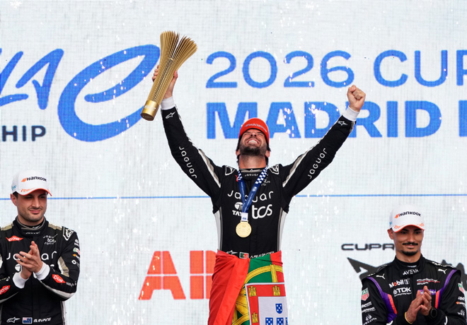 Antonio Félix da Costa realizó una maniobra impecable en su parada en boxes (Pit Boost) en su camino hacia la victoria en la primera carrera de Fórmula E en Madrid, superando a su compañero de equipo Mitch Evans para lograr un doblete de Jaguar Racing, por delante de Pascal Wehrlein de Porsche.