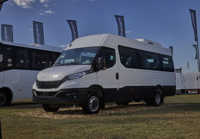 También se exhibió el Minibus Daily 50-170, una solución de transporte de pasajeros que combina tamaño compacto con buen desempeño. Está equipado con un motor FPT F1C DS de 4 cilindros y 2.998 cm³, que desarrolla 170 cv de potencia máxima a 2.900 rpm y 450 Nm de torque entre 1.250 y 2.900 rpm, y una caja manual ZF de 6 marchas más reversa y tracción trasera. Con 4.100 mm de distancia entre ejes y 7.253 mm de largo total, ofrece configuración para 19 asientos de respaldo alto semicama más el puesto del conductor. Además, cuenta con calefacción y aire acondicionado dual, ventanas con vidrios templados y sistemas de seguridad ABS y ESP, brindando confort y estabilidad.