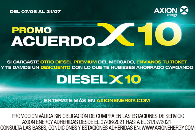 AXION energy, presenta su exclusivo Acuerdo X10, una promo en la que todos aquellos que carguen otro diésel premium del mercado, podrán enviar el ticket a través de WhatsApp y acceder a un descuento exclusivo, equivalente a lo que se ahorrarÃan si cargaban el nuevo AXION Diesel X10. Sigue leyendo