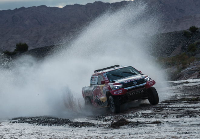 Nasser Al-Attiyah ha reafirmado su intención de poner fin a la hegemonÃa Peugeot con una primera victoria de especial que muy probablemente no será la última. Su compañero de equipo Bernhard Ten Brinke confirma el excelente estado de forma del nuevo Toyota mientras Stéphane Peterhansel rodaba a la defensiva. En motos, Sam Sunderland, con KTM, se convierte asà en el primer lÃder del rally con 32'' de ventaja sobre Adrien Van Beveren, que ha firmado una excelente actuación al manillar de su Yamaha. Sigue leyendo