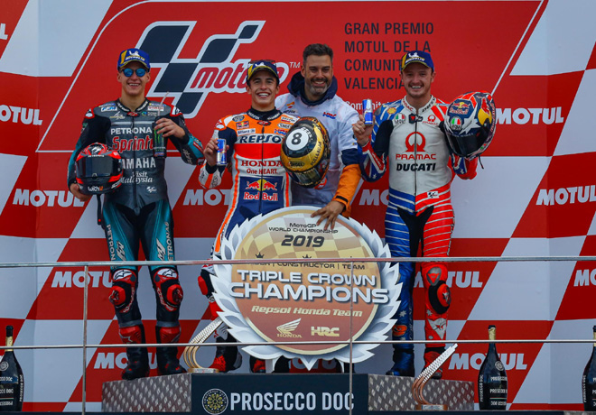 Marc Márquez y Jorge Lorenzo fueron los grandes protagonistas en el cierre de la temporada 2019 de MotoGP en Valencia. Los dos pilotos del Repsol Honda Team consiguieron los puntos necesarios para batir al Ducati Team en la pelea por el Título por Equipos, lo que permite a Repsol Honda alzar la Triple Corona, tras el título individual de Marc y el de Constructores, y deja a Jorge con un buen sabor de boca en el día de su adiós. Sigue leyendo