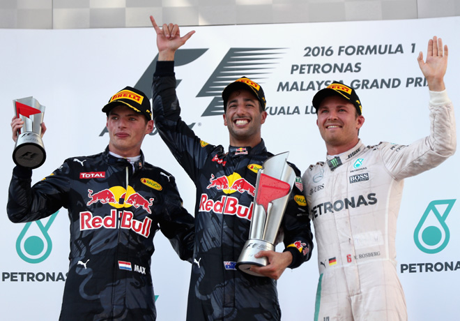 Daniel Ricciardo fue el ganador del Gran Premio de Malasia, superando a su compañero en Red Bull Racing, Max Verstappen, por 2.443 segundos. Tercero terminó Nico Rosberg con el Mercedes, quien ante el abandono de Lewis Hamilton por la rotura del motor de su Mercedes alargó la diferencia en el campeonato a 23 unidades. Sigue leyendo