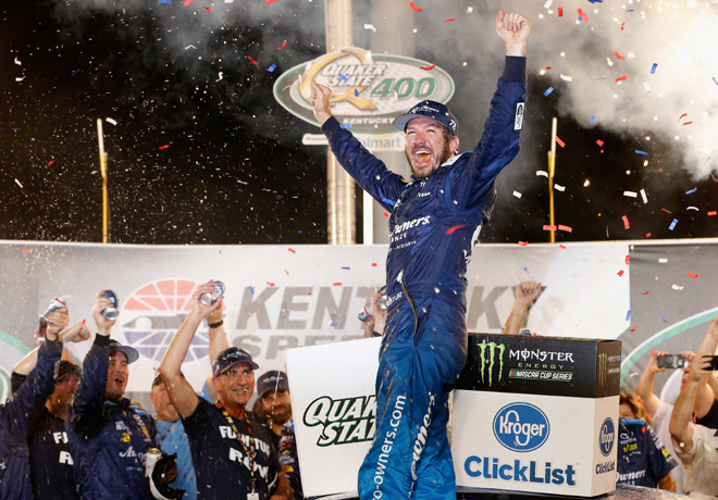 Después de comenzar desde la pole position, Martin Truex Jr. ganó las tres etapas para adjudicarse la victoria en forma contundente en Kentucky, habiendo liderado 174 vueltas de 267. Este fue su cuarto triunfo en la temporada y el 19º en NASCAR. Sigue leyendo