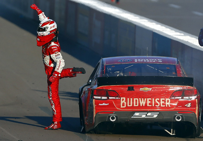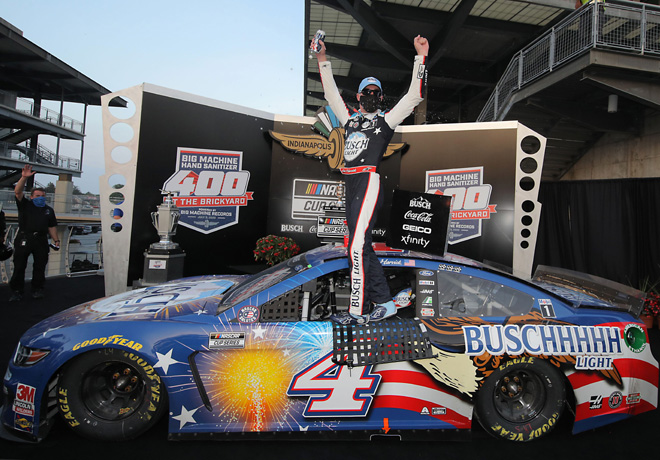 Harvick lideró 68 de las 161 vueltas con su Ford número 4. Él y Denny Hamlin tuvieron una apretada disputa para decidir quién de ellos llegaría a la victoria. Pero a poco del final -faltaban solamente 7 vueltas- el Toyota de Hamlin sufrió el reventón de un neumático y se estrelló violentamente contra la pared de la curva 1. Sigue leyendo