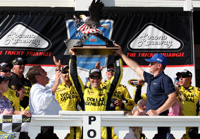 Matt Kenseth (Toyota) ganó su primera carrera en el Pocono Raceway, después de que Joey Logano; Kyle Busch y Martin Truex Jr. se quedaran sin combustible a poco del final. Sigue leyendo