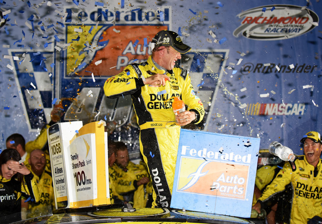Siendo el líder de la competencia en el óvalo de Richmond durante 352 de las 400 vueltas pactadas, Matt Kenseth (Toyota) se alejó de su compañero de equipo Kyle Busch (Toyota) tras el último reinicio con 18 vueltas por correr para ganar la Federated Auto Parts 400 con 0.951 segundos de ventaja. Joey Logano (Ford) llegó en la 3ª posición, seguido de Aric Almirola (Ford), quien se quedó a 17 puntos de desbancar a Menard por un lugar en la postemporada. Dale Earnhardt Jr. (Chevrolet) completó el Top 5. Sigue leyendo