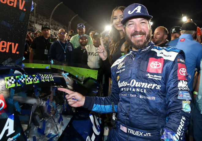 Tras sobrevivir un incidente en que perdió el control de su Toyota luego de un toque con el Ford de Ricky Stenhouse Jr. cuando iba en primer lugar, Truex Jr. adelantó a su compañero de equipo Kyle Buch a 25 vueltas del final para encaminarse a la victoria. Sigue leyendo