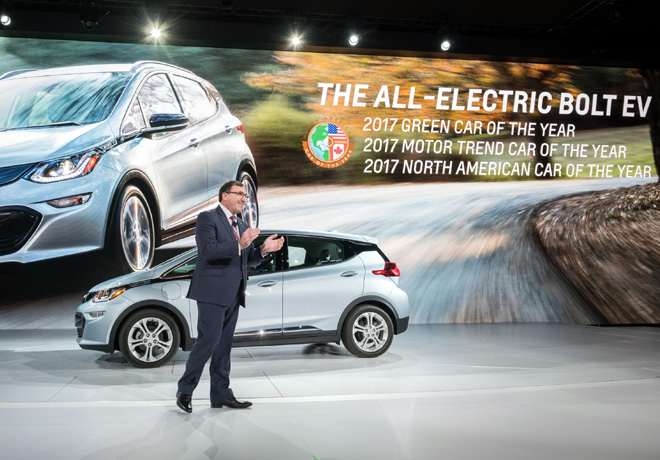 En el Salón Internacional del Automóvil de Norteamérica (NAIAS), el Chevrolet Bolt EV fue nombrado Auto del Año 2017. Con este reconocimiento, se suman cuatro galardones en cuatro años que Chevrolet ha recibido el premio North American Car and Truck of the Year, tras las victorias de Corvette Stingray y Silverado en 2014 y el premio de Colorado en 2015. Sigue leyendo