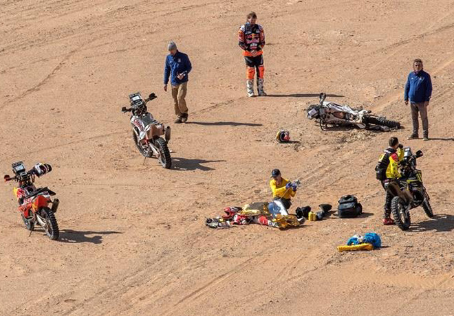 La séptima etapa ha quedado marcada por la fatal caída de Paulo Gonçalves, que disputaba su décimo tercer Dakar. Las victorias de Kevin Benavides en motos y Carlos Sainz en coches pasan a un segundo plano en una jornada que se clausurará con un homenaje al piloto portugués del equipo Hero durante la reunión informativa diaria con todos los participantes. Sigue leyendo