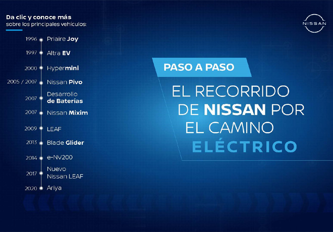 En un viaje hacia un mundo más conectado y sustentable, Nissan fue pionera en la investigación y el desarrollo de la movilidad eléctrica. Pero, ¿cómo comenzó esta historia? ¿Cuáles fueron sus principales modelos eléctricos que despertaron admiración y permitieron la evolución hasta el dÃa de hoy? Sigue leyendo