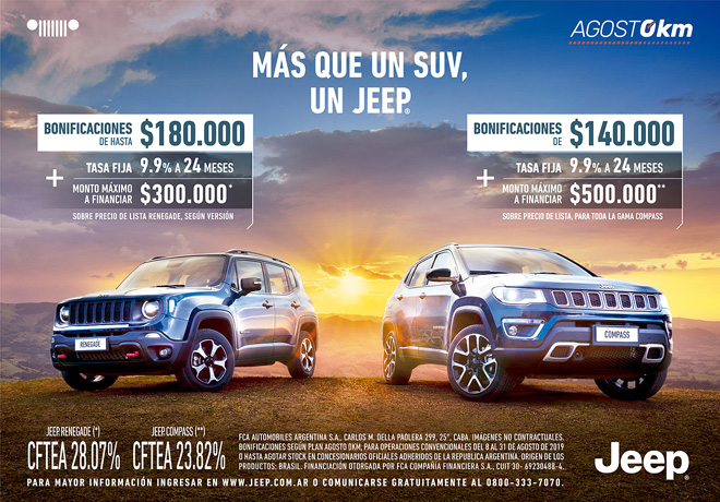 FCA informó que se mantienen todas las bonificaciones vigentes en todos los modelos Jeep en el marco del plan Agost0km. La empresa destaca que todos los modelos que se comercializan en pesos tienen una suba del 12% promedio. Sigue leyendo