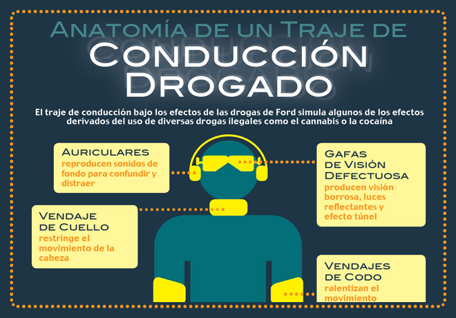 Ford ha desarrollado este traje junto a científicos del Instituto Meyer-Hentschel de Alemania para simular algunos de los efectos que producen drogas como el cannabis, la cocaína, la heroína y el MDMA (más conocido como éxtasis). Estos incluyen la ralentización del tiempo de reacción, la distorsión de la vista, el pulso tembloroso y una pobre coordinación. Sigue leyendo
