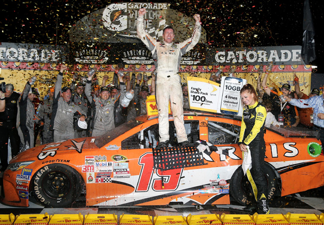 Carl Edwards fue el vencedor en la noche de ayer de una carrera emocionante en el Darlington Raceway. El piloto de Toyota se adueñó del primer lugar tras una rápida parada en los boxes bajo la 18ª bandera amarilla, y se abrió camino al triunfo en el último reinicio faltando ocho vueltas, para conseguir el primer éxito en esta pista de 1.366 millas; la segunda victoria de la temporada y la número 25 en la Serie. Sigue leyendo