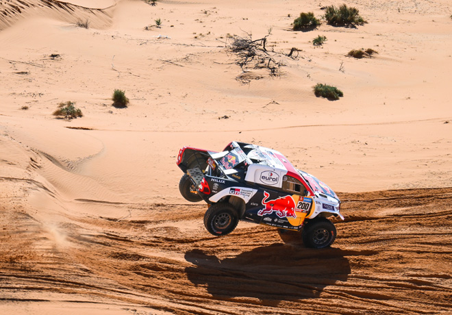 Durante el centenar de kilómetros anteriores a la meta, la carrera terminaba por pistas rápidas con algunos tramos pedregosos que requerían vigilancia. Se trataba de un terreno familiar para los hermanos Benavides, que registran los dos mejores tiempos en motos. Lo que tienen en común con Mattias Ekström y Stéphane Peterhansel, protagonistas de un doblete para Audi en la etapa, es que ya no tienen opciones a la victoria final en Yanbu. Sigue leyendo