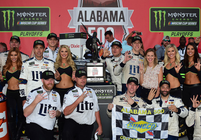 Aric Almirola ganó la competencia disputada en Talladega en tiempo extra, aprovechándose de quien era el lÃder de la carrera, Kurt Busch, que se quedó sin combustible en la última vuelta. Fue la primera victoria de la temporada de Almirola y la segunda en NASCAR, que lo deposita en la Ronda 8 en los Playoffs. Sigue leyendo